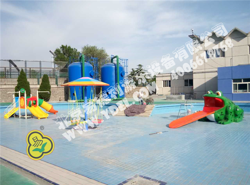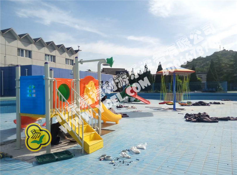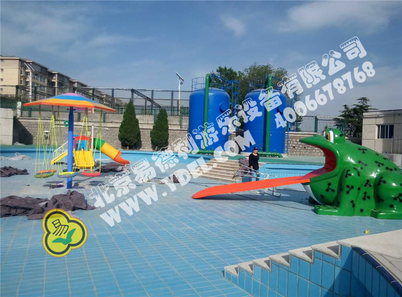 吐著大紅舌頭的青蛙滑梯小品,形象栩栩如生,小小水滑梯,簡單卻也是一種樂趣,水秋千,在水里也能享受陸上游樂玩耍。