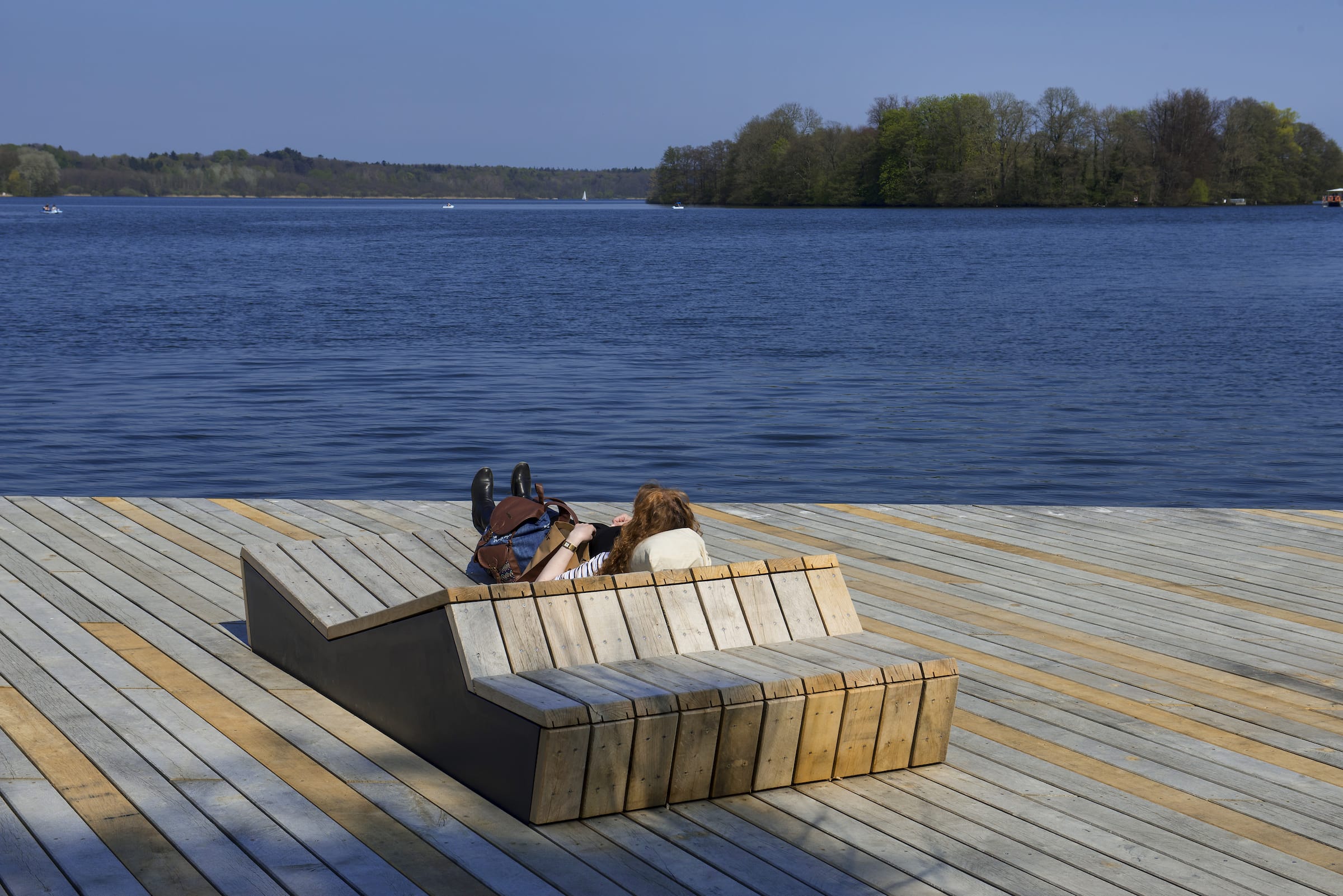 The offerings are situated along new park axes that – in reference to the historic Lindenallee in the Schlossgarten – also function as paths and visual axes that proceed into the lake as wooden piers, widen at their ends to form seating platforms and create appealing new opportunities for recreation directly at the water. With its views of the lake, Stadtbucht and the castle, the water is now an integral component of the park. An additional aspect is the selective access to the lakeshore, which serves to protect the surrounding shore areas and reed populations. While significant clearing was undertaken to create the park axes, sightlines and expansive recreational meadows, the alder swamp forest along the shore areas in the park’s north was ecologically restored.
