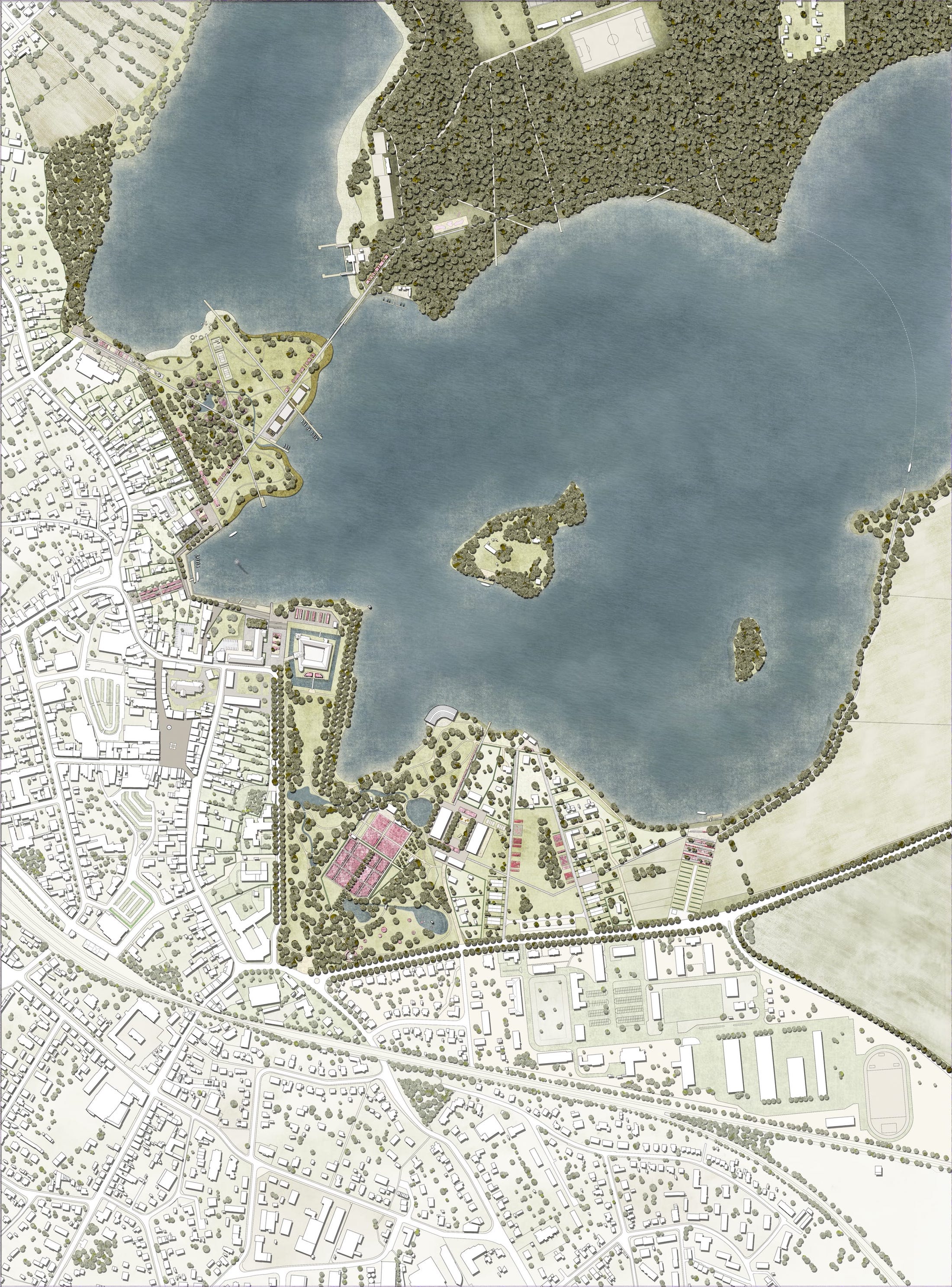 Eutin是一個(gè)該地區(qū)重要的住宅和商業(yè)區(qū)域,也是老城市中心,以磚木結(jié)構(gòu)建筑、古典建筑和巴洛克式的城堡為特色,坐落兩個(gè)風(fēng)景如畫的湖泊之間,即Großer Eutiner湖和Kleiner Eutiner湖。該地區(qū)位于荷爾斯泰因瑞士自然保護(hù)區(qū)內(nèi),是德國(guó)北部?jī)?nèi)陸地區(qū)最受歡迎的旅游目的地。盡管位置優(yōu)越,但除了歷史悠久的Schlossgarten (城堡花園)之外,湖岸未建的城市地區(qū)在設(shè)計(jì)或娛樂質(zhì)量方面卻鮮有建樹。水幾乎沒有得到考慮,沒有道路網(wǎng)絡(luò),更明顯的是,沒有家庭和年輕人真正的體育或娛樂機(jī)會(huì),受到地標(biāo)保護(hù)的Schlossgarten suf也因其使用需求過高而受損。