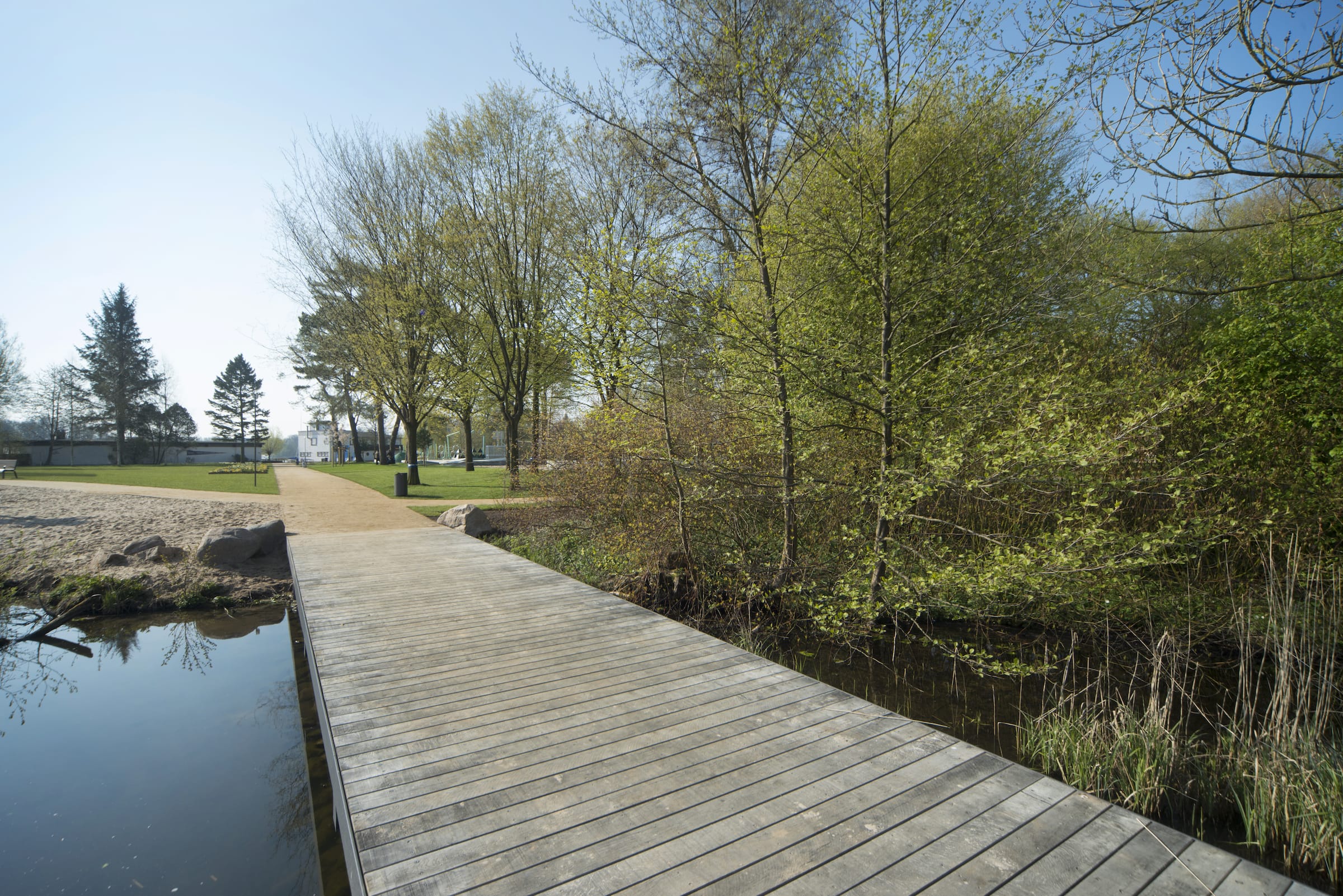 新的公園軸線,參考?xì)v史悠久的Lindenallee Schlossgarten,也起到了進(jìn)入湖中的路徑和視覺軸線的作用,比如木制碼頭,在它們的末端加寬以形成座位平臺(tái),并直接在水上創(chuàng)造吸引人的新娛樂機(jī)會(huì),從這里可以看到湖泊、體育場(chǎng)和城堡,這里的水現(xiàn)在是公園不可分割的一部分。另外一個(gè)方面是有選擇地進(jìn)入湖岸,這有助于保護(hù)周圍的海岸地區(qū)和蘆葦種群。雖然進(jìn)行了大量的清理工作來創(chuàng)建公園軸線、視線和廣闊的休閑草地,但公園北部沿岸的榿木沼澤森林也得到了生態(tài)修復(fù)。