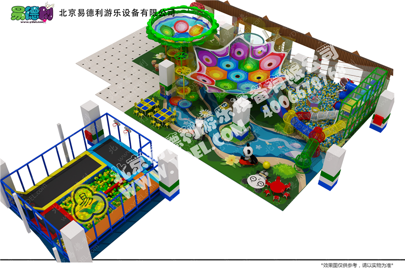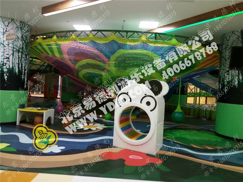 滿屋子的彩色繩網(wǎng),這邊竄到那邊,那邊竄到另一邊,沉浸在歡樂的彩色繩網(wǎng)世界,這還沒完,連貫到皇冠網(wǎng)龍區(qū)一直到球池中央,孩子們樂享不停。深重綠色世界,各種熊貓角色,有種臥龍山區(qū)美感。